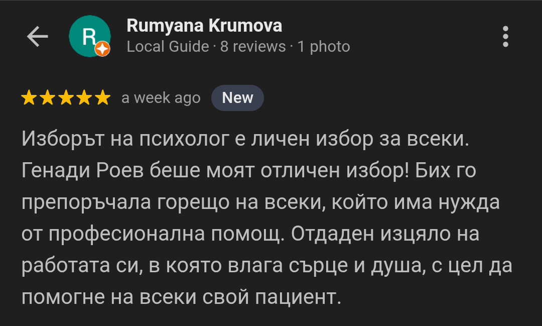 Генади Роев е психолог в София с над 13 години опит. Работи индивидуално, провежда и семейни консултации. Подкрепя при стрес, бърнаут, тревожност, проблеми с идентичността и самочувствието. Оказва помощ при фобии, паник атаки, преживяване на скръб и загуба. Работи с представители на LGBT+ общността. Предлага подкрепа при проблемно поведение при подрастващи и техните семейства. Консултира младежи в процеса на кариерно ориентиране. Не работи със зависимости и хранителни разстройства. Генади Роев консултира възрастни и деца над 14-годишна възраст.