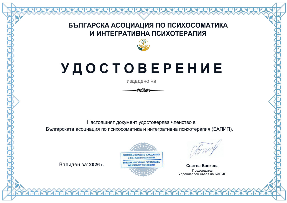 - Член на Българска асоциация по интегративна психотерапия.